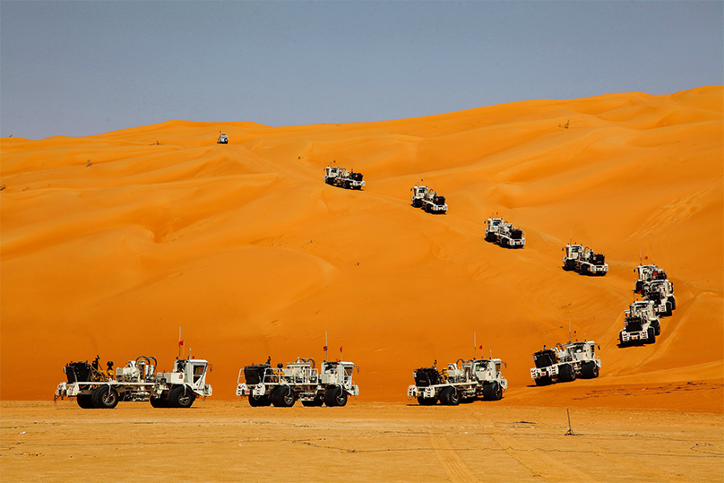 该技术已成为提质提速提效的关键技术,从2021年起在准噶尔盆地实现了地震采集项目的可控震源全覆盖,支撑了在沙特阿美等国际知名石油公司地震勘探业务的拓展。在沙特S84项目,探索应用宽频高效可控震源技术,采用震源无号高效施工,连续7次刷新中国石化震源施工日产纪录,5次打破沙特阿美物探日产纪录。